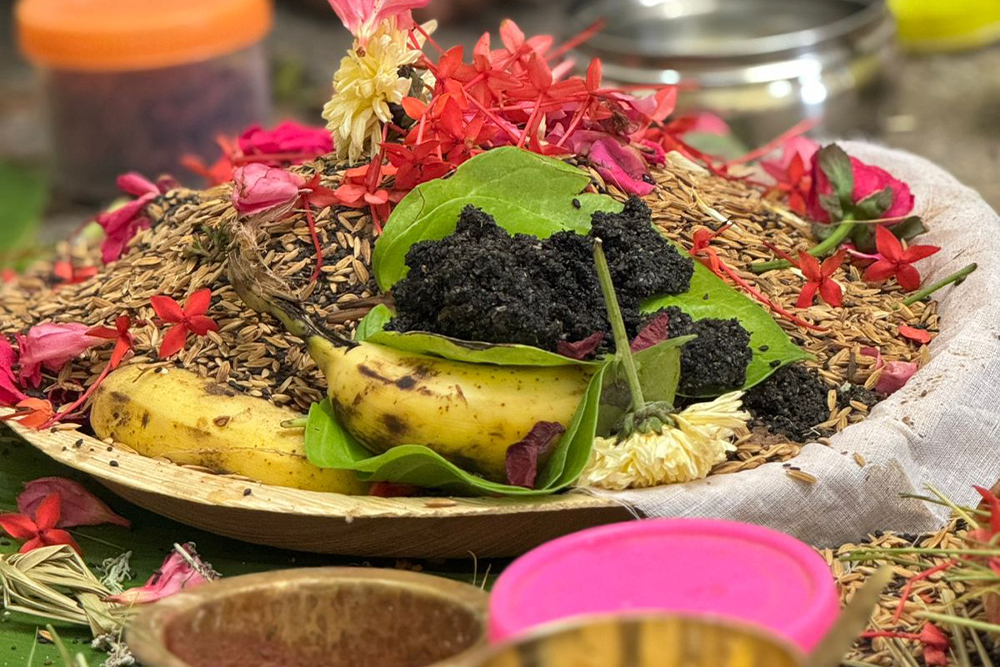 A pooja performed to offer food to ancestors, seeking their blessings for family unity and harmony.