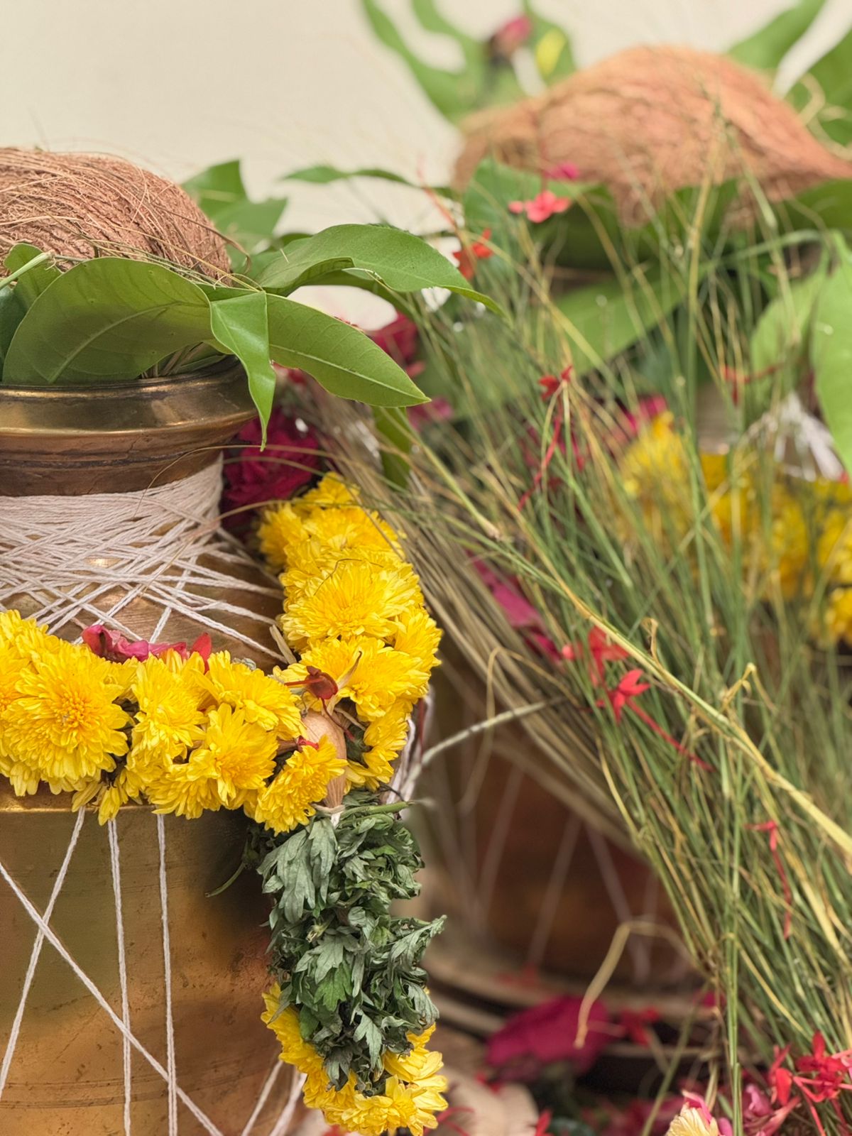 Completing the pooja : After all offerings are made, prayers are chanted for peace, prosperity, and family well-being mainly getting blessings from the ancestors and giving food in the form of pindam (rice balls)